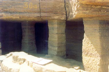 | Eingangsbereich von QH 30a, im Vordergrund der Überrest der Frontwand | Blick in die Kultkammer |