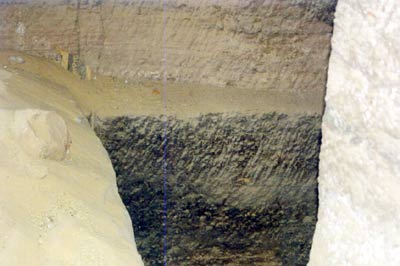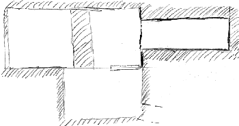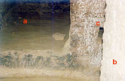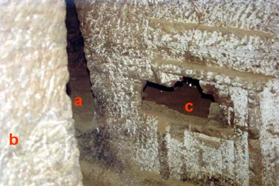 | Blick in die Nebenkammer (a), rechts der Pfeiler (b) und durch diesen teilweise verdeckt, der Wanddurchbruch zur Nebenkammer (c) | Der Durchbruch zur Nebenkammer (c) befindet sich direkt neben dem Eingang zur Kammer und ist in einer Scheintür eingearbeitet. Er wirkt wie ein Serdab-Schlitz, ist allerdings sehr niedrig. |