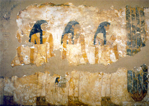 Über dem 1. und 4. Fisch sind die Maschen des Netzes erkennbar. Links von dem Fischzug war vermutlich die Verarbeitung des Fanges dargestellt; als einziger Überrest ist der Kopf eines aufgeschnittenen Mormyrus (niloticus) erhalten. Besuch der Frauen im Grabe Die Darstellungen des zweiten und dritten Bildstreifens über der Fischerei gehören zusammen. Äußerlich ist die szenische Einheit durch blaugemalte Papyrusbündelsäulen, die die Höhe der beiden Streifen haben, kenntlich gemacht. Die Säule, die die beiden Streifen nach links abschloß, ist nicht mehr vorhanden, von der zweiten ist die untere Hälfte über der Basis erhalten. Zwischen den beiden Säulen waren Frauen in zwei Streifen übereinander dargestellt. Ihr Vorhandensein im oberen Streifen ist durch die Füße, die über der Basislinie erhalten sind, bezeugt. Im unteren Streifen sind drei Frauen fast vollständig erhalten, zwischen der zweiten und dritten ein kleines Mädchen. Drei weitere Frauen lassen sich aus den vorhandenen Resten erschließen. Die Frauen blicken nach rechts, schreiten also vom Eingang, neben dem sich die Darstellungen befinden, in das Innere der Räume. Sie tragen langes Haar, das enganliegende Trägergewand, den Perlenkragen und Arm- und Fußringe mit farbigen Einlagen: grün, rot und blau. Das unbeschädigte Profil der zweiten Frau zeigt eine auffallend zierliche Nase. Der Gegenstand, den sie in der vor dem Körper herabhängenden Hand hielten, ist durch den Riß, der die Figuren schneidet, zerstört. Nach den schlecht erhaltenen Umrissen des Gegenstandes in der Hand der sechsten Frau auf dem Stuckrest links könnte es eine Perlenkette mit einem Schulterschlußstück (Menit) gewesen sein. Den einzelnen Frauenfiguren ist der Name beigeschrieben (von rechts): (1) "Seine geliebte Schwester Anuket", (2) "Seine geliebte Schwester Sat-ten", (3) "Seine geliebte Schwester Heteput", (4) "Seine geliebte Schwester ....".. Der darüberliegende Streifen muß eine ähnliche Gruppe von Frauenfiguren enthalten haben. Die Darstellungen rechts vom Säulenschaft sind sehr beschädigt. Die Fläche ist wagerecht in einen schmalen unteren und einen etwas breiteren oberen Streifen unterteilt. In dem unteren ist das Schlachten eines Rindes dargestellt; in dem oberen drei Männer, die nach rechts schreiten. Der vordere trägt eine Rindskeule, die beiden anderen große Körbe in den vorgestreckten Händen. Die beiden von Papyrussäulen zusammengefaßten Bildstreifen setzen sich auf der Südwand in gleicher Höhe fort. Die geringen Reste, die hier erhalten sind, sind die Ergänzung zu den Darstellungen auf der Ostwand und bieten den Schlüssel zu ihrem Verständnis. Eine sichere Erklärung der Darstellungen, mit denen der Streifen in der Wandecke beginnt, ist infolge der allzu geringen Stuckreste nicht zu geben. Deutlich erkennbar sind die Beine von zwei Männern, die bei einer gemeinsamen Arbeit einander zugekehrt sind. Vielleicht setzt diese Gruppe die Darstellung des Schlachtens fort, die auf der Ostwand unmittelbar anschließt. Nahe dem linken Rande ist der untere Teil eines Säulenschaftes erhalten, und rechts davon in einigem Abstand der Rest einer zweiten Säule. Neben der ersten Säule ist eine Gruppe von drei Figuren erkennbar: der Säule zunächst nach rechts gewandt, eine stehende männliche Gestalt im langen Schurz auf einem Sockel, also wahrscheinlich eine Statue des Fürsten. Zu Füßen der Statue hocken zwei Frauen, die einander zugewandt sind, auf einer Matte am Boden. Von dem untergeschlagenen Fuß ist die Fußsohle sichtbar. Die linke Figur ist annähernd vollständig: die eine Hand liegt ausgestreckt an der Wange; der andere Arm ist vor dem Körper gebeugt, die Hand ist mit dem Stuck weggebrochen. Die beiden hockenden Frauen waren gegengleich dargestellt; auch die Frau rechts trug langes Haar, die eine Hand lag an der Wange, die andere wies mit ausgestrecktem Zeige- und Mitteliinger schräg nach oben. Die Fläche über den Frauen trug eine lange hieratische Inschrift, von der größere Stücke erhalten sind. Das Erhaltene ist jedoch teilweise durch Schwärzung unkenntlich geworden und nur vereinzelt sind Zeichengruppen lesbar. Eine Übersetzung des Textes ist nicht zu geben. Zwischen der Figurengruppe und der rechten Säule ist zwar der Stuckgrund erhalten, seine Oberfläche ist jedoch sehr beschädigt. Hier könnte eine weitere Figur, vielleicht eine zweite Statue angebracht gewesen sein. Was diese Szene darstellt ist klar. Die Säulen und die Statue deuten das Grab an. Auch Opferträger und Schlächter sind zugegen. Es ist also ein Besuch der Frauen im Grabe dargestellt. Die einzelnen Motive: Säulen, Statuen und Sängerinnen kommen in den Gräbern von Beni Hasan mehrmals in der Nähe der Scheintür vor. Das Besondere und Neue der Gestaltung der Szene in diesem Grabe liegt in der Zusammenfassung der Motive zu einer bildlichen Einheit. Wäscher am Fluß In dem unteren Streifen ist die Wäscherei am Flusse dargestellt: Am Ufer sind die gewaschenen Laken zum Trocknen ausgelegt; die Ränder sind mit kleinen Steinen beschwert, damit die Laken nicht vom Winde weggeweht werden. Uber dem Wasserstreifen stehen die Wäscher: In der Mitte der erhaltenen Stuckfläche eine Gruppe von zwei Männern, die ein Laken um einen in den Boden gerammten Pfahl, der nicht erhalten ist, geschlungen haben und es mit Hilfe eines Stabes, der durch das andere Ende gesteckt ist, auswringen. Das Wasser, das aus den Windungen des Lakens tropft, war durch feine Pünktchenreihen wiedergegeben, die am Original noch eben erkennbar sind. Hinter den Wringern liegen zwei Wäschesäcke. Rechts von dieser Gruppe steht ein Wäscher, der über einen Bottich gebeugt ist; anschließend sind die Beine eines zweiten erhalten, der wohl mit der Verrichtung einer ähnlichen Arbeit beschäftigt war. Danach folgt eine breite Lücke und in dieser ist im Abstand von etwa 30 cm ein Stuckfragment erhalten, das zu der Darstellung der Wäscherei gehört: zwei Ar